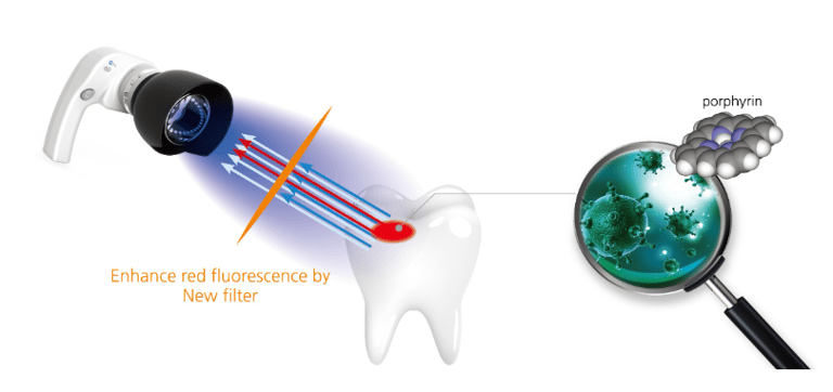 The Qray is a dental biofilm detection system which utilizes the clinically proven “Quantitative Light-induced Fluorescence” technology that uses blue light(405nm) and a special filter to detect dental biofilm. Under our device, areas with tooth mineral loss appear dark because they cannot absorb any visible light, but porphyrin that originates from the biofilm creates a visible fluorescence. With such mechanism, plaques, caries, prostheses, and cracks can easily be detected.